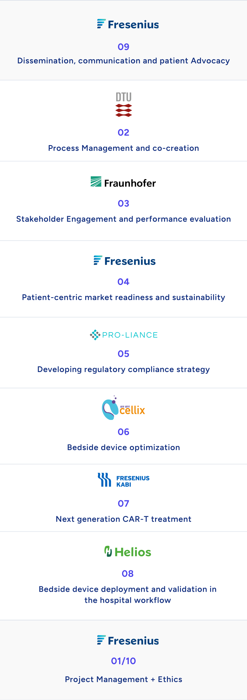 WP4 defines and validates patient eligibility criteria to identify new cohorts who stand to benefit from the modular CAR-T device, leveraging clinical expertise and data analytics to model anticipated outcomes. A comprehensive market and competitor analysis maps current trends, barriers to entry, and growth projections, informing optimal positioning within healthcare systems. Finally, insights from WP2 are used for exploitation and sustainability strategies that outline clear commercialization pathways, partner engagement, and scalable roll-out plans to ensure long-term integration and impact of the innovation.